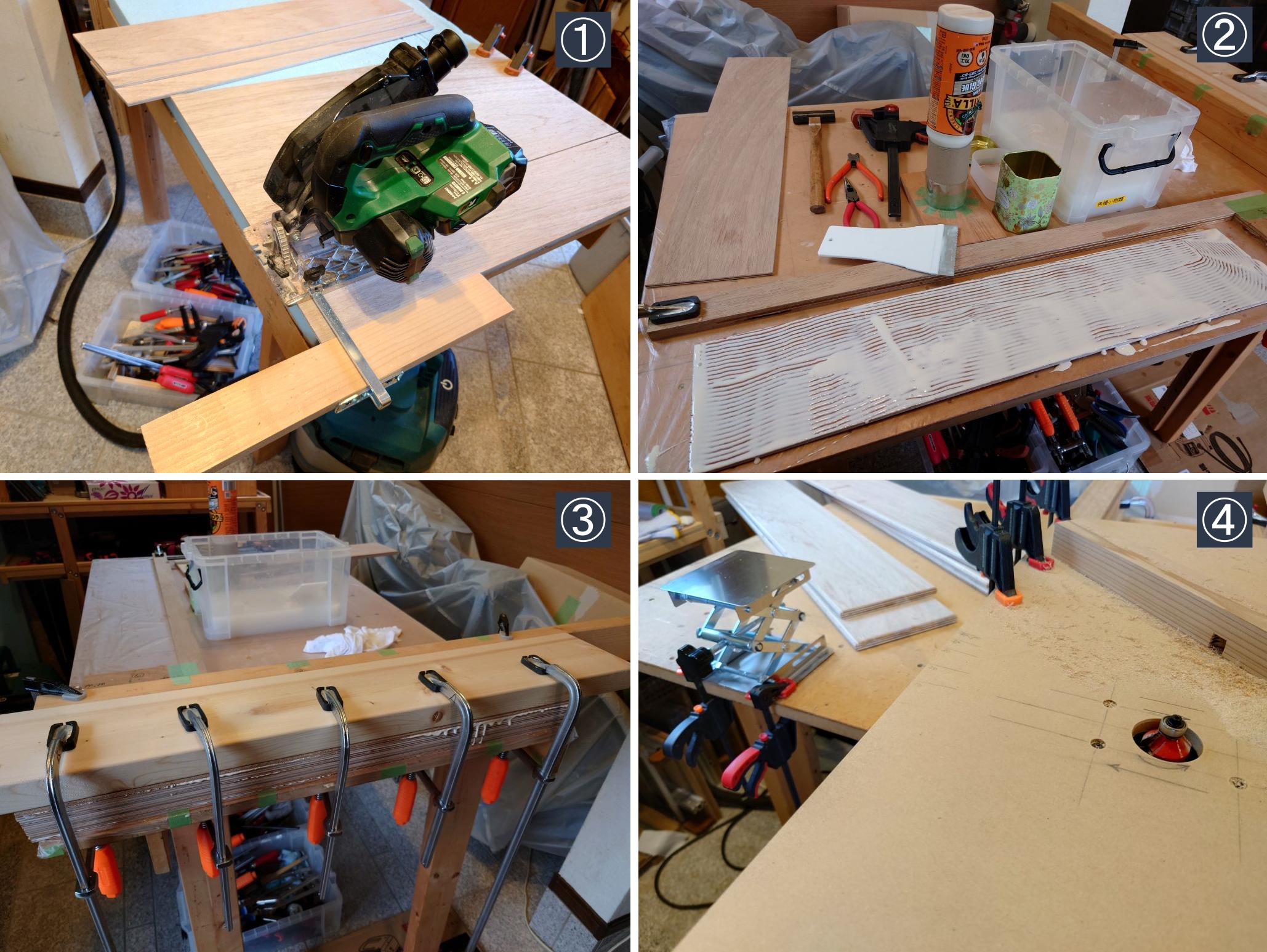 作業台の後ろで以前使った「板立て具」を使って乾燥