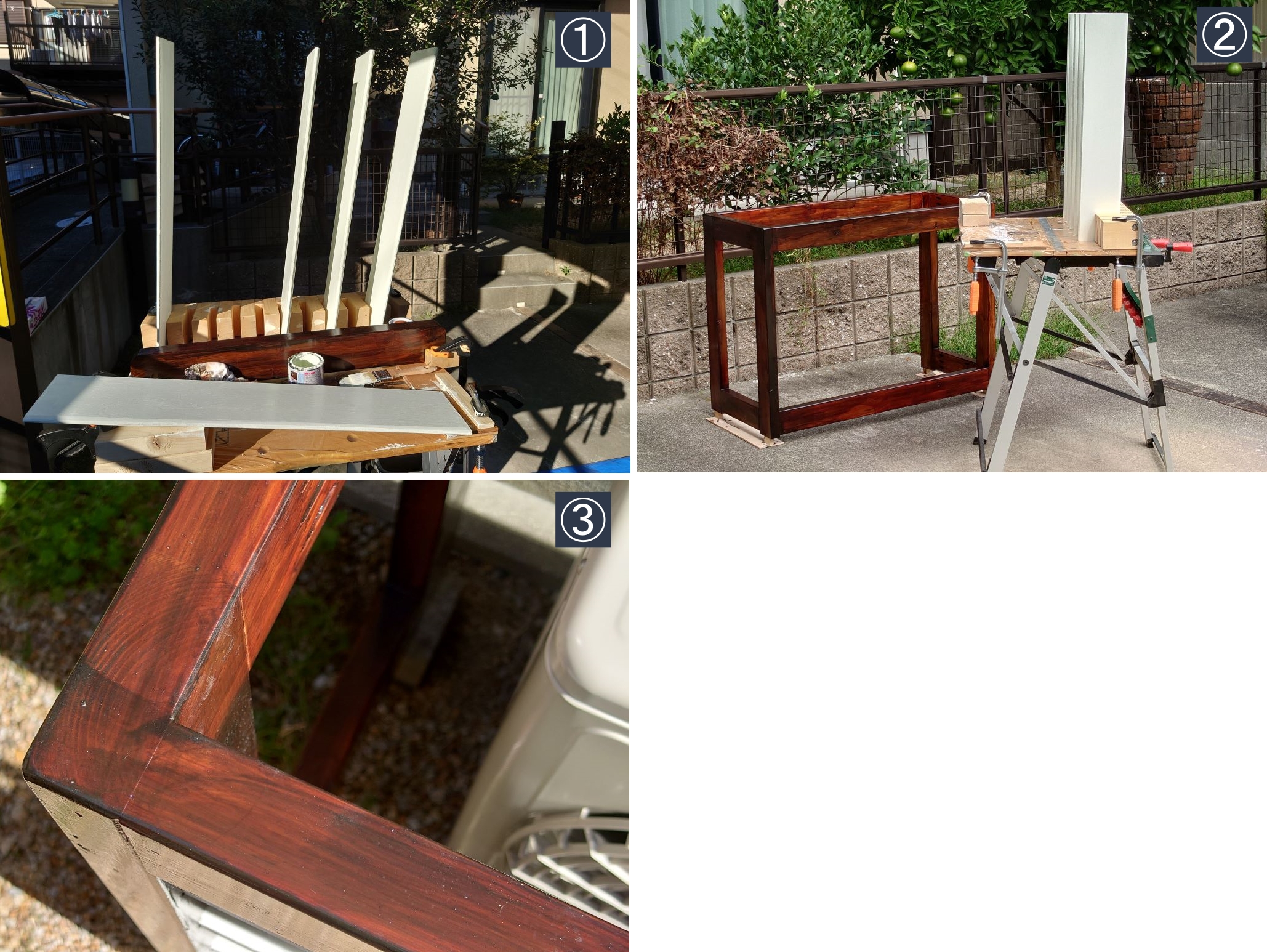 ③ 枠は木目が透けて見える「赤系の透明な塗料」を下塗りして、その上に「黒系の透明な塗料」を重ね塗りしています
